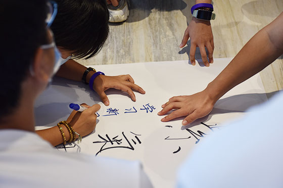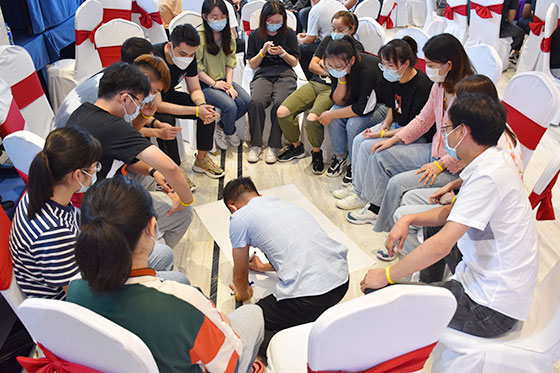 在活動開始,胡老師通過“異掌同聲”、“新朋友手拉手”、“認(rèn)識新朋友”等活動,讓志愿者們活用身體和語言,讓大家快速熟悉彼此。志愿者不僅是個人的社會身份,更是對一個集體、一類人群的稱呼。在接下來的活動中,胡老師變大集體為小組,志愿者們以小組為單位完成不同的任務(wù)和挑戰(zhàn),在活動中更加理解和明晰團(tuán)隊與合作的內(nèi)涵。在“團(tuán)隊建立”的活動中,小組初步形成;“小繩圈闖三關(guān)”的游戲則是對團(tuán)隊凝聚力的試煉和升華,而最后的“激情節(jié)拍”則是運(yùn)用激昂的節(jié)奏充分激發(fā)志愿者們對團(tuán)隊的認(rèn)可和歸屬。