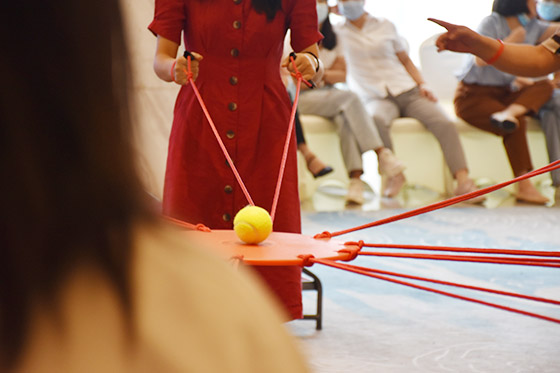 在活動開始,胡老師通過“異掌同聲”、“新朋友手拉手”、“認識新朋友”等活動,讓志愿者們活用身體和語言,讓大家快速熟悉彼此。志愿者不僅是個人的社會身份,更是對一個集體、一類人群的稱呼。在接下來的活動中,胡老師變大集體為小組,志愿者們以小組為單位完成不同的任務和挑戰(zhàn),在活動中更加理解和明晰團隊與合作的內(nèi)涵。在“團隊建立”的活動中,小組初步形成;“同心鼓”的游戲則是對團隊凝聚力的試煉和升華,充分激發(fā)志愿者們對團隊的認可和歸屬。